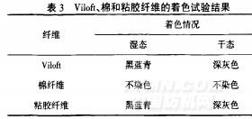由表3可知,Vilofl纖維用碘一碘化鉀溶液著色后,濕態(tài)呈黑藍(lán)青、干態(tài)呈深灰色,與粘膠纖維基本相同,而棉纖維濕態(tài)和干態(tài)均不染色.因此,用碘一碘化鉀溶液著色可區(qū)分棉與Vilofi纖維,但不能區(qū)分Viloft纖維和粘膠纖維.