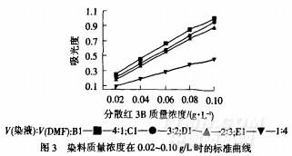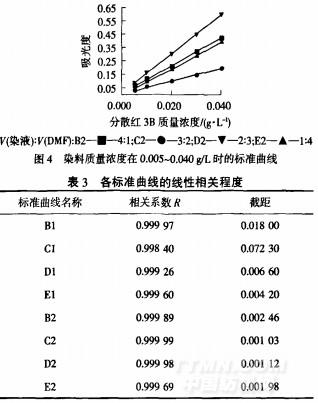 以染料質(zhì)量濃度[將原始染液(分散紅3B0.2g/L、NNOlg/L、pH5)用水稀釋而成,沒有加入DMF]為橫坐標(biāo),染液與DMF按一定體積比混合后所測得的吸光度為縱坐標(biāo)作圖,結(jié)果如圖3、4所示.然后用Origin軟件對圖3、4中各標(biāo)準(zhǔn)曲線進(jìn)行線性擬合,各標(biāo)準(zhǔn)曲線的直線相關(guān)系數(shù)見表3.