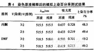 把配制的0.2g/L染液用水稀釋至0.04g/L作染色原液,再將該染液用水稀釋一倍作染色殘液,即理論上染百分率為50%.將染色原液與殘液分別按照一定體積比加入丙酮或DMF后,再用紫外分光光度計測試吸光度,按公式計算上染百分率,結(jié)果見表4.