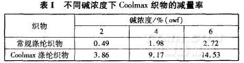 采用不同堿濃度對常規(guī)滌綸針織物和Coolmax導(dǎo)濕快于纖維針織物進(jìn)行堿減量處理,結(jié)果見表1。