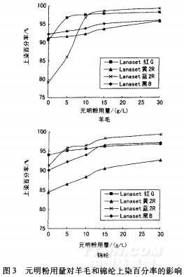 從圖3可以看出,元明粉用量在0—15g/L時(shí),4只染料的上染百分率均隨元明粉用量的增加逐漸增大;元明粉用量超過l5L后,染料的上染百分率基本不變。在中性浴中染色,染浴pH值高于羊毛和錦