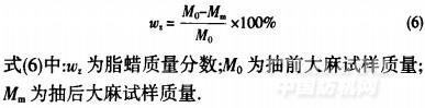 麻纖維中的脂是高級脂肪酸的甘油酯,蠟質(zhì)的主要成分是高級飽和脂肪酸和高級一元醇所形成的酯,此外,尚有部分游離的高級脂肪酸、高級醇及烴類.脂和蠟均不溶于水,但可被有機溶劑萃?。捎觅|(zhì)量法測定,稱取3 g麻試樣,烘干稱質(zhì)量后放在油脂抽出器中,用苯和乙醇溶液[V(苯):V(乙醇)=2:l]在恒溫下萃取4 h(回流速率4-6次/}1),烘干稱質(zhì)量,按公式(6)計算脂蠟的質(zhì)量分數(shù):