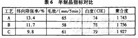 由表6可見,采用退煮漂三步法毛效高,但降強(qiáng)率也高,白度偏低;采用雙氧水冷堆工藝,白度有所提高,降強(qiáng)有所降低,但毛效略低;采用有機(jī)過氧酸冷堆法,降強(qiáng)最低,白度最高,毛效適中。對(duì)比不同工藝處理后織物的聚合度,有機(jī)過氧酸冷堆法的聚合度最高,即其受到的潛在損傷最小。