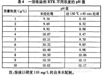 —浴練染劑RTK不同濃度的pH值變化情況見(jiàn)表4。