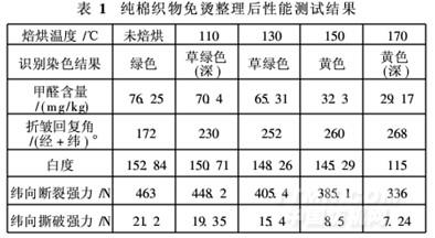 對純棉織物進(jìn)行樹脂免燙整理,焙烘后剪取6 cm×4 cm試樣,稱重,進(jìn)行染色試驗。免燙整理試樣的顏色、強(qiáng)力、甲醛含量和折皺回復(fù)角等結(jié)果見表1。
