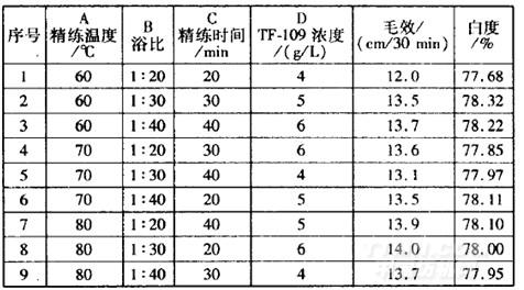 109質(zhì)量濃度>精練溫度>浴比和精練時(shí)間。優(yōu)選方案為A3B3C2D3,即TF一109質(zhì)量濃度6g,/L,浴比l:40,精練溫度8O℃,處理時(shí)間30min。影響織物白度的主次順序?yàn)椋篢F一109質(zhì)量濃度>浴比和精練時(shí)間>精練