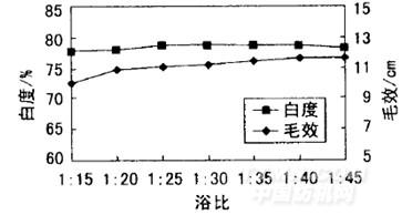 由圖7可知,浴比從1:15提高至1:20,對(duì)毛效的提高作用較明顯。此后繼續(xù)提高浴比,毛效變化不大。從白度變化曲線(xiàn)看,其受浴比變化的影響很小。