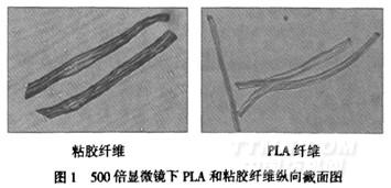 在500倍顯微鏡下觀察PLA和粘膠纖維的縱向截面圖,結(jié)果見圖1.