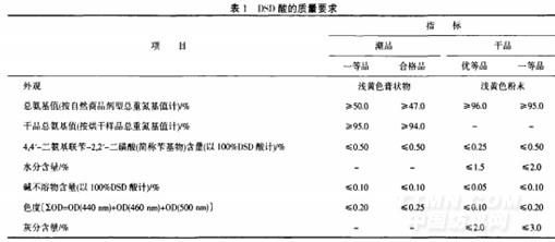 DSD酸中所含的有機(jī)雜質(zhì)品種多,有些有機(jī)雜質(zhì)至今未能定性,還是未知物,在標(biāo)準(zhǔn)中對(duì)大部分有機(jī)雜質(zhì)作出限量規(guī)定目前還有很多難度并且大大增加了檢驗(yàn)的工作量,不適用于工業(yè)化大生產(chǎn),因此增加“DSD酸純度”檢驗(yàn)項(xiàng)目規(guī)定其限量就能較準(zhǔn)確地表述出DSD酸產(chǎn)品質(zhì)量的優(yōu)劣,是一個(gè)又好又省又快的方法.