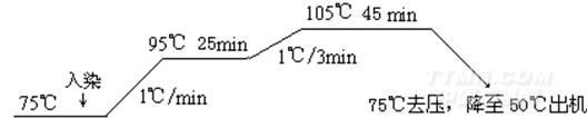 陽離子染料用醋酸調(diào)勻,沸水溶解,稀釋后加入染浴,再加入緩染劑1227,控制染浴pH值在4~5,75℃入染10min,按工藝條件逐漸升溫升溫至95℃,25min內(nèi)升溫至105℃保持40~50min)染畢,降至60℃,放水,清洗。