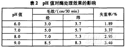 由表2可知,增大處理浴pH值,織物毛效提高。處理浴pH值為6.0和8.0時,精練汗布的失重較小,可能是由于酶活不足;pH值為7.0和9.0時,織物失重較大。為了減少實際生產(chǎn)中酸中和等工序,并考慮果膠酶活力等因素,保持處理浴的pH值為近中性,即無需調(diào)節(jié)pH值直接應(yīng)用。