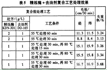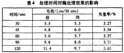 采用精練酶KDN-301 2 g/L,在中性浴中于55℃處理不同時間,測定其失重率和毛效,見表4。