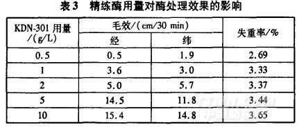 取不同用量精練酶KDN-301,在中性浴中于溫度55℃處理汗布60 min,測定其失重率和毛效,見表3。