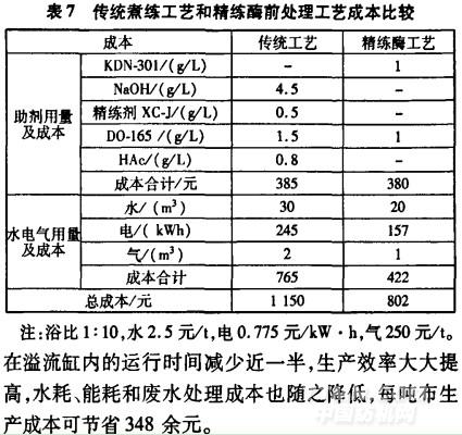 按生產(chǎn)1噸布計(jì)算,KDN-301低溫酶精練工藝和傳統(tǒng)煮練工藝的成本比較見表7。