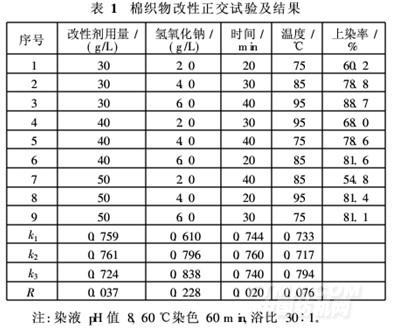 表1中,各因素對上染率影響按大小順序排列為:氫氧化鈉用量(改性溫度(改性劑用量(改性時(shí)間。