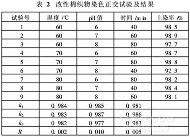 將優(yōu)化改性工藝處理的棉織物采用L9(33)正交試驗(yàn)進(jìn)行染色,測試改性棉織物的上染率,見表2。