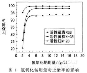 (1)氫氧化鈉用量對上染率的影響在陽離子改性劑用量為40 g/L、氫氧化鈉用量為2. 0~16 g/L的改性液中,于95℃對棉織物改性處理30 min,然后水洗至中性,烘干。用三種活性染料進(jìn)行
