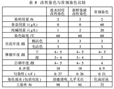 由于改性棉織物染色時(shí)無(wú)需用鹽,染料上染率為98%,因而嘗試將其染色廢水回用于改性染色,并與新鮮染液改性染色和常規(guī)染色進(jìn)行比較,結(jié)果見(jiàn)表5。
