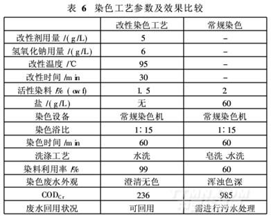 由表5知,改性后染色織物的K/S值比未改性染色織物大得多,得色明顯加深;ΔE均小0. 50,勻染性較好;改性后織物的上染率由傳統(tǒng)染色的72%提高到98%,染料利用率顯著提高。利用改性染色后的廢水染色,其性能指標(biāo)與采用常規(guī)相當(dāng),表明改性染色廢水可以回用。