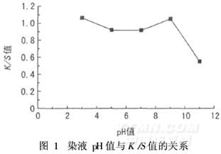 選用醋酸和碳酸鈉為pH值調(diào)節(jié)劑,按1. 3. 2節(jié)工藝(下同)對(duì)珍珠纖維織物進(jìn)行染色,織物K/S值隨染液pH值的變化如圖1所示。