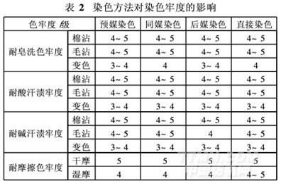 由表2可知, 4種染色方法的干濕摩擦牢度都可達(dá)到4級(jí)以上,耐皂洗色牢度和耐汗?jié)n牢度除變色牢度外,都可達(dá)到4級(jí)以上。而同媒染色法較預(yù)媒染色法和后媒染色法工藝簡(jiǎn)單,可操作性強(qiáng),節(jié)約用水和熱能,更利于生產(chǎn),節(jié)約成本。