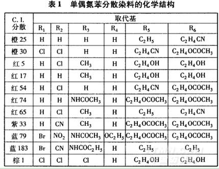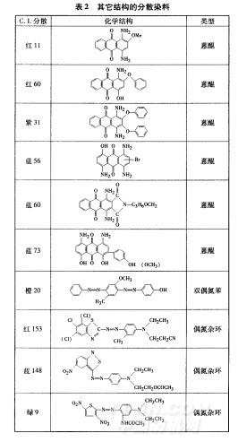 染化料 商品分散染料(部分結(jié)構(gòu)見表1和表2),碳酸鈉、醋酸、醋酸鈉、保險(xiǎn)粉和N,N.二甲基甲酰胺(DMF,均為分析純試劑),硼氫化鈉、亞硫酸氫鈉(均為工業(yè)品),分散勻染劑Dispertex RP-131(臺灣聚益化學(xué)工業(yè)股份有限公司)