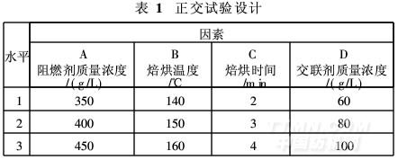 (1)取FPK8002阻燃劑質(zhì)量濃度、交聯(lián)劑質(zhì)量濃度、焙烘溫度和焙烘時(shí)間為四個(gè)因素,分別選取三水平,依據(jù)L9(34)表安排試驗(yàn),因素水平見表1。