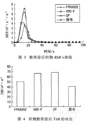 圖3和圖4表明,經(jīng)過(guò)阻燃整理后,織物的熱釋放速率(RSR)峰值及總煙釋放量(TSR)均高于原布。這是由于阻燃處理降低了纖維熱解過(guò)程中可燃?xì)怏w的相對(duì)釋放量(難燃或不燃性氣體釋放量相對(duì)增加),造成揮發(fā)性可燃物發(fā)生不完全燃燒或來(lái)不及燃燒而隨著熱氣流逸出,表現(xiàn)出較大的煙霧釋放速率;而未阻燃處理纖維素燃燒相對(duì)完全,主要生成對(duì)可見(jiàn)光吸收較小的二氧化碳?xì)怏w,煙釋放速率相對(duì)較低。