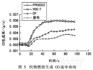由圖5知,織物在燃燒過(guò)程會(huì)釋放出有毒性的可燃性氣體CO,且整理后織物在燃燒過(guò)程中生成的CO速率均高于未處理試樣。這可能是阻燃劑的存在促進(jìn)纖維熱解產(chǎn)物不完全氧化,并抑制了改性滌棉混紡織物氣相燃燒的充分進(jìn)行,從而導(dǎo)致CO釋放量加劇。