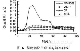 圖6顯示,未處理試樣的CO2生產速率曲線存在明顯的峰值,其值均高于阻燃整理后試樣;而經(jīng)阻燃整理試樣的CO2生成速率曲線較平坦。這說明未處理試樣燃燒比較充分,釋放出大量讓人窒息的CO2,而阻燃劑則有效抑制了CO2生成。