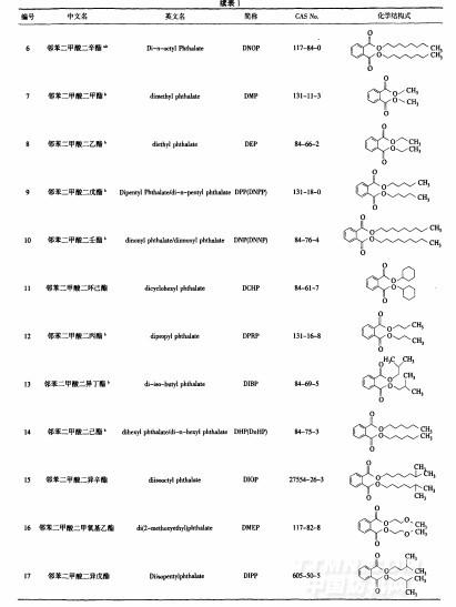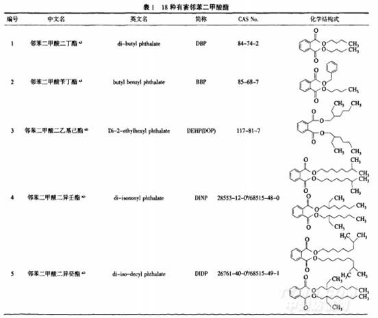 美國(guó)環(huán)境保護(hù)局在1997年提出了70種屬于環(huán)境激素的化學(xué)物質(zhì),其中有8種是鄰苯二甲酸酯,它們是DEHP、BBP、DBP、DCHP、DEP、DPP、DHP和DPRP.[5]表1列出目前各國(guó)法規(guī)中涉及的以及經(jīng)研究表明對(duì)人體和環(huán)境存在危害風(fēng)險(xiǎn)的18種鄰苯二甲酸酯.