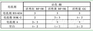從表4可以看出,無(wú)磷皂洗劑HS-634皂洗后的防沾色能力明顯優(yōu)于堿性皂洗粉HSK-2。紅、黃、藍(lán)染色織物經(jīng)HS-634皂洗后,防沾色能力較HSK-2分別提高了1.0、0.5、1.5級(jí),較空白樣均提高了1.5級(jí);活性紅BF-3B染色物經(jīng)HS-634皂洗后的防沾色能力較皂洗