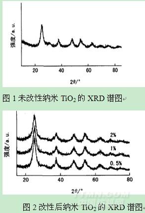 改性前后制備的納米TiO2的XRD譜圖,如圖1和圖2所示。