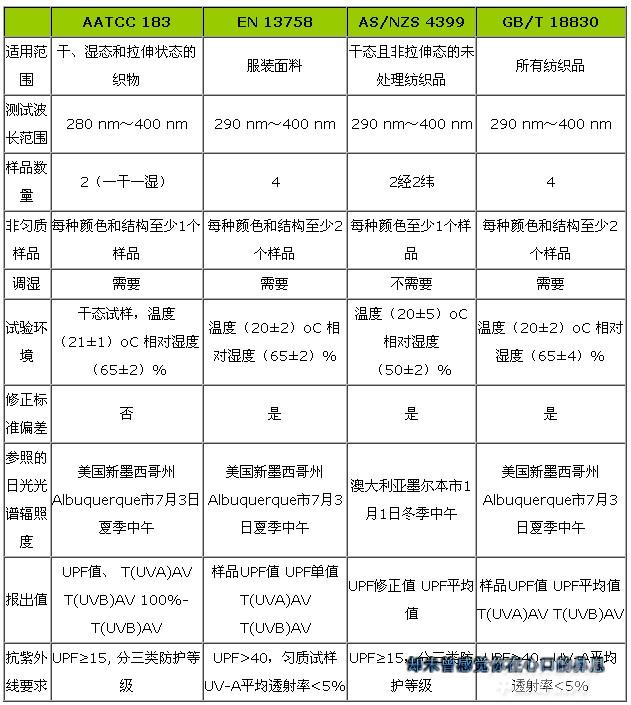 各國標準對紡織品防紫外線的測試要求和判定都不相同,具體見表2。
