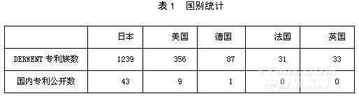 對國外DERWENT公開的專利族進(jìn)行統(tǒng)計分析,發(fā)現(xiàn)聚乳酸專利主要申請的國家為日本、美國、德國、法國和英國。日本公開的專利數(shù)量遠(yuǎn)超過其它國家,居全球之首。在中國,日本申請的專利公開數(shù)量遠(yuǎn)高于美國與德國,占聚乳酸中國專利總數(shù)的28%,其數(shù)量在一定程度上表明了日本積極搶占中國聚乳酸領(lǐng)域市場的戰(zhàn)略動向。具體情況如表1。