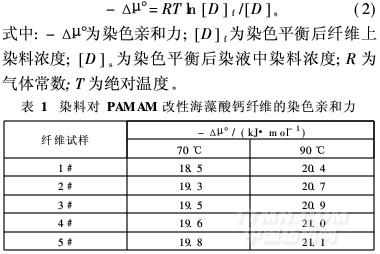 AM改性海藻酸鈣纖維的染色熵為正值,說明直接染料湖藍5B對PAMAM改性海藻酸鈣纖維的親和力很好,直接染料可以用于PAMAM改性海藻酸鈣纖維的染色,實現(xiàn)海藻酸鈣纖維的無鹽染色。