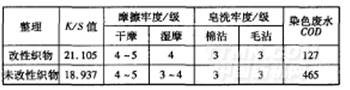 表1中,改性織物染色K/S值較常規(guī)染色高,摩擦牢度、皂洗牢度與未改性織物相比變化不大。改性織物的染色廢水COD值較常規(guī)染色廢水大幅降低。
