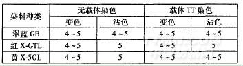 由表2可知,載體TT對(duì)染樣的色相影響不大。載體染色對(duì)色牢度的影響如表3所示。