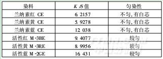 注:M型活性染料浸染工藝:食鹽30g/L,純堿20g/L,染色溫度65℃,固色時(shí)間30min。
