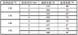 在丙烯酸酯黏合劑質(zhì)量分數(shù)為50%的情況下,改變焙烘溫度和時間,測試夜光涂層織物的耐磨性和懸垂性能,結(jié)果見表1。