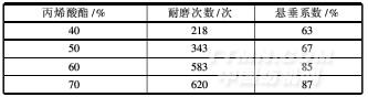 焙烘溫度130℃,時間3min,改變丙烯酸酯黏合劑的質(zhì)量分數(shù),測試夜光涂層織物的耐磨性及柔軟性,結(jié)果見表2。