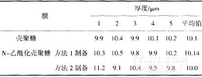 由表1可知,經(jīng)方法1與方法2制備的N-乙化殼聚糖膜與純殼聚糖膜厚度相近,說明殼聚糖膜經(jīng)N-乙?;幚韺穸鹊挠绊懞苄。?/p>