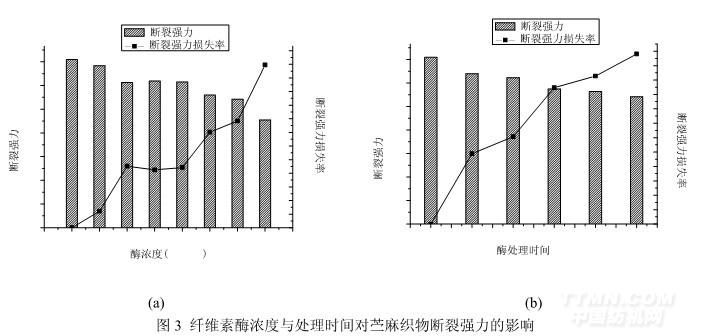 由圖 3(a)可知,隨著纖維素酶濃度的增加,苧麻織物的斷裂強(qiáng)力逐漸降低,特別是高濃