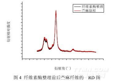 為進(jìn)一步分析適度纖維素酶整理對(duì)苧麻纖維結(jié)晶度的影響,對(duì)酶處理前后苧麻纖維進(jìn)行