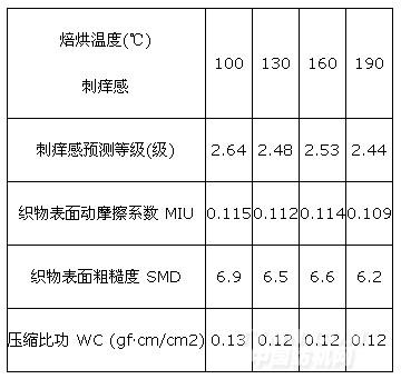 聚氨酯的成膜過程,焙烘溫度低,交聯(lián)和成膜過程可能不充分;焙烘溫度越高,聚氨酯反應(yīng) 活性越高,能夠發(fā)生充分反應(yīng),但溫度過高時,結(jié)合主觀感受發(fā)現(xiàn),織物手感會發(fā)硬,對降 低刺癢感產(chǎn)生不利影響。