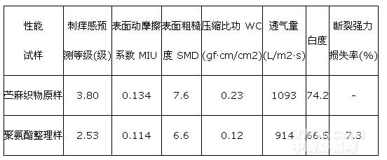 2.2.2 彈性聚氨酯整理苧麻織物的性能和形態(tài)結(jié)構(gòu)分析 將苧麻織物的彈性聚氨酯整理優(yōu)化工藝進行再試驗,測試織物刺癢感及透氣性能、白度