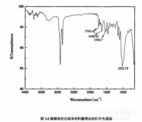 為了更好的說明納米材料和棉纖維的交聯(lián)情況,對棉織物進(jìn)行了紅外光譜測試,見圖3.8。