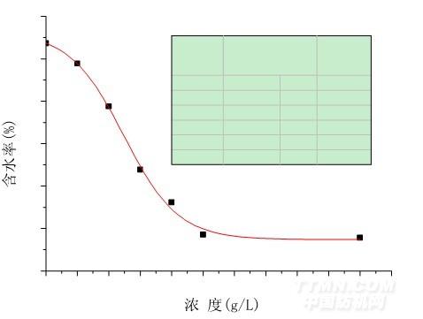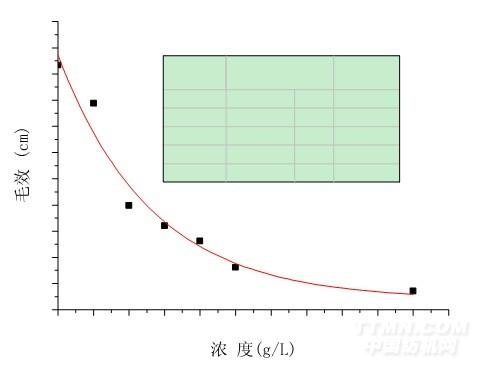 △P 的大小主要取決于θ和 r 的大小。當接觸角 0°<θ<90°時,COSθ大于零,△P 大于零,外界對水滴施加的壓力和毛細管附加壓力方向相同,水就能順利通過毛細管。當觸 角 90°<θ<180°時,COSθ小于零,△P 小于零,毛細管附加壓力阻止水的透過。在本 試驗中,隨著濃度的增大,試樣的接觸角逐漸增大,拒水性能越來越好,導(dǎo)致毛效快速的下 降。