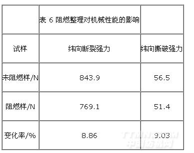 阻燃劑用量 250g/L,160℃焙烘 75S,純堿調(diào)整理液 pH 值為 6 的條件下對(duì)棉織物進(jìn)行 阻燃整理,考察阻燃整理對(duì)織物機(jī)械性能的影響,結(jié)果如表 6。