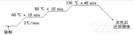 由于該染色布為超細(xì)纖維,表面吸附能力強(qiáng),在溫度比較低時(shí),染料已基本吸附在布上,容易產(chǎn)生色花,所以在染色升溫時(shí),需在60℃和80℃時(shí)分別進(jìn)行保溫。染色采用中央染控系統(tǒng),控制減量以及染色過(guò)程中的溫度。同時(shí)染色時(shí)在保證不色花的前提下,適當(dāng)調(diào)低噴嘴壓力,降低布的轉(zhuǎn)速,減少染液對(duì)布面的沖擊,防止布面起毛。